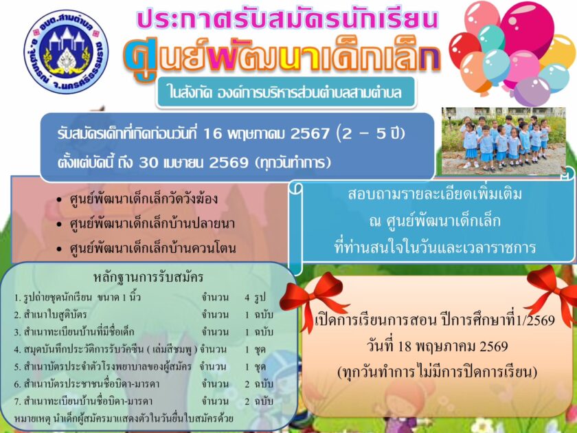 ประกาศรับสมัครนักเรียนศูนย์พัฒนาเด็กเล็กในสังกัดองค์การบริหารส่วนตำบลสามตำบล 4 มีนาคม 25694 มีนาคม 2026อบต. สามตำบล-02ข่าวประชาสัมพันธ์, จดหมายข่าว ประกาศรับสมัครนักเรียนศูนย์พัฒนาเด็กเล็กในสังกัดองค์การบริหารส่วนตำบลสามตำบล โดยรับสมัครเด็ก 2 – 5 ปี (เกิดก่อนวันที่ 16 พฤษภาคม 2567) Post Views: 2 FacebookFacebookXXLINELine
