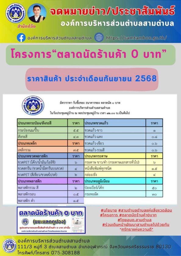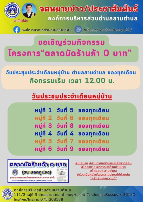 องค์การบริหารส่วนตำบลสามตำบล รับซื้อขยะ ในวันประชุมหมู่บ้าน ของทุกเดือนเริ่มเวลา 12.00 น. เป็นต้นไป ณ หอประชุมหมู่บ้าน ในกิจกรรม โครงการตลาดนัดร้านค้า 0 บาท โดยการนำขยะมาขายแลกคูปอง