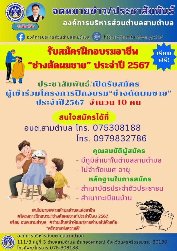 ประชาสัมพันธ์ 7 มกราคม 2567อบต. สามตำบล-02กิจกรรมเด่น, ข่าวประชาสัมพันธ์ ประชาสัมพันธ์ ขอเชิญผู้สนใจสมัครเข้าร่วมโครงการฝึกอบรมอาชีพ”ช่างตัดผมชาย”ประจำปี 2567 สมัครได้ที่ อบต.สามตำบล ตั้งแต่บัดนี้เป็นต้นไป #นโยบาย”สามตำบลตำบลแห่งอาชีพ” #โครงการพัฒนา ส่งเสริมอาชีพตำบลสามตำบล #โดย อบต.สามตำบล #ร่วมเดินหน้าพัฒนาสามตำบลไปด้วยกัน “ศรัทธาแห่งความดี” •————————————-• ทนายสุรศักดิ์ ไชยรักษา นายก อบต.สามตำบล Post Views: 21 FacebookFacebookXXLINELine