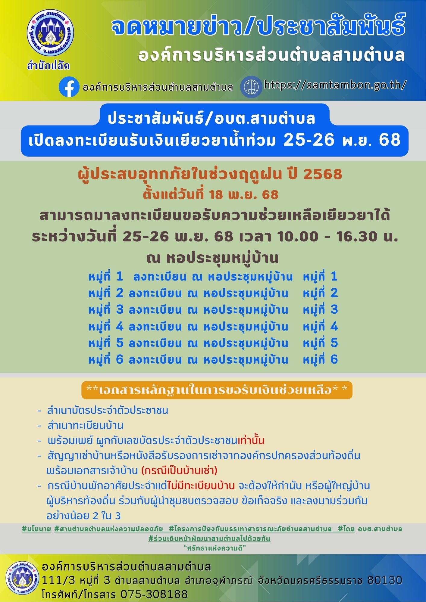 วันที่ 27 พฤศจิกายน 2568 ทนายสุรศักดิ์ ไชยรักษา นายกองค์การบริหารส่วนตำบลสามตำบลตรวจดำเนินการรับรองและลงระบบข้อมูลผู้ประสบภัยประเภทบุคคลธรรมดา รับเงินเยียวยาประสบภัยพิบัติน้ำท่วม 9,000 บาท ตามคำร้องขอรับความช่วยเหลือผู้ประสบอุทกภัยในช่วงฤดูฝน ปี 2568 ในพื้นที่ตำบลสามตำบล