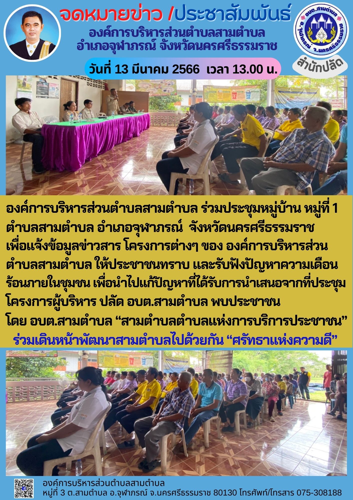 | 28 กันยายน 2564 | ขยายกรอบเวลาแผนปฏิบัติการป้องกันการทุจริตขององค์การบริหารส่วนตำบลสามตำบล |