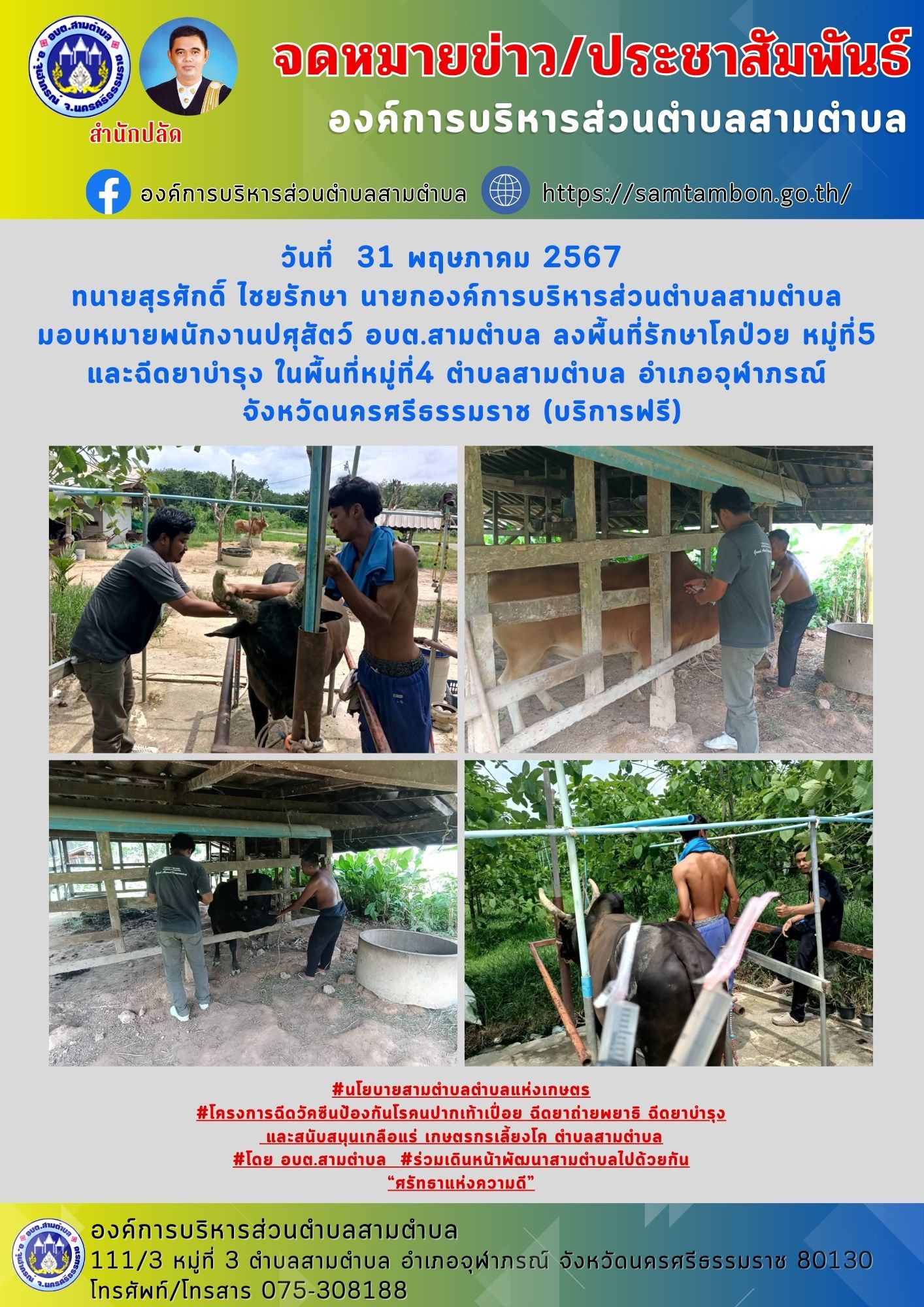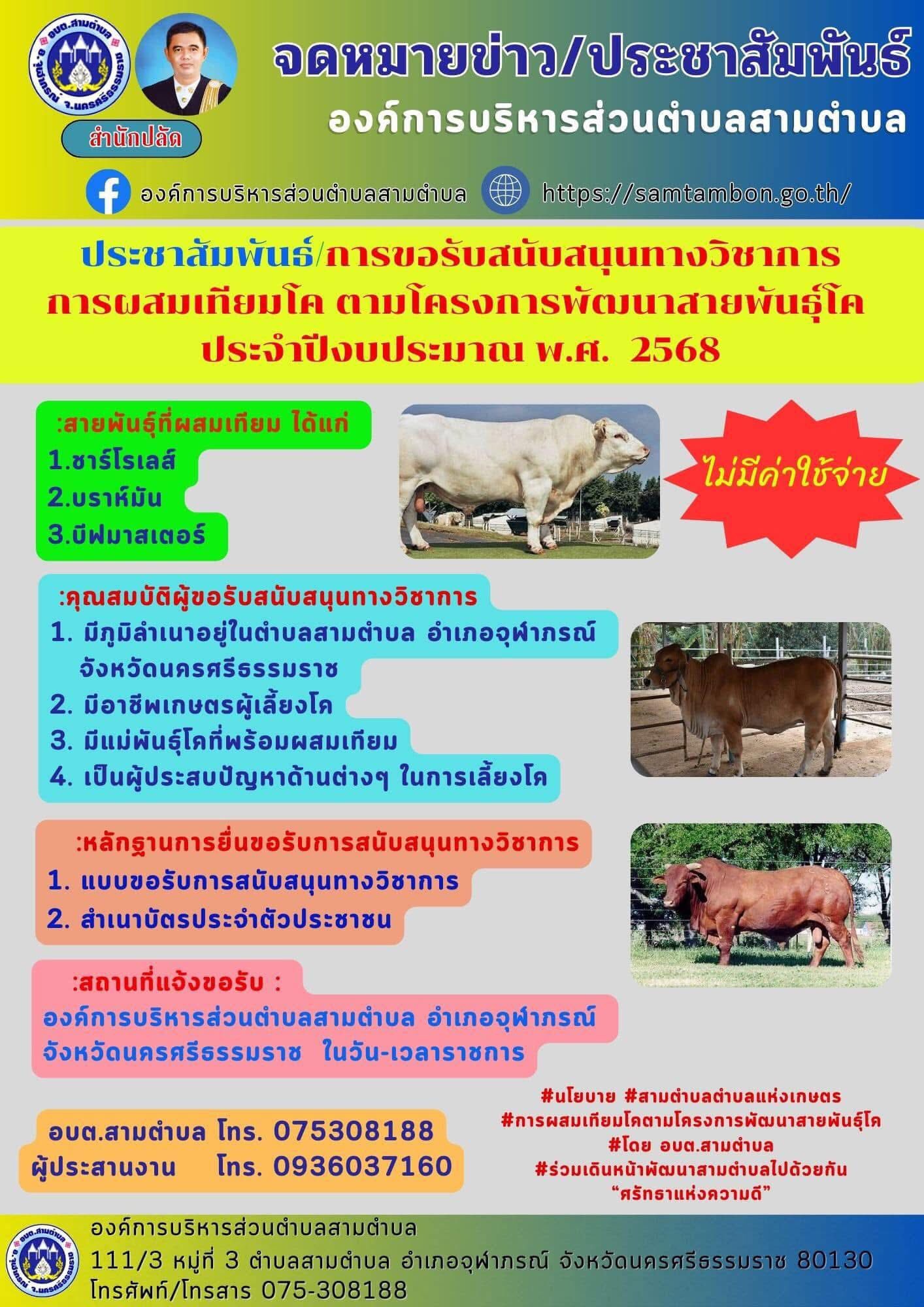 วันที่ 15 กันยายน 2568 ทนายสุรศักดิ์ ไชยรักษา นายกองค์การบริหารส่วนตำบลสามตำบลมอบหมายพนักงานปศุสัตว์ อบต.สามตำบล ลงพื้นที่บริการผสมเทียมน้ำเชื้อโคพันธุ์ ฟรีน้ำเชื้อ ฟรีบริการผสมเทียม ให้กับเกษตรกรหมู่ที่ 5 ตำบลสามตำบล อำเภอจุฬาภรณ์ จังหวัดนครศรีธรรมราช